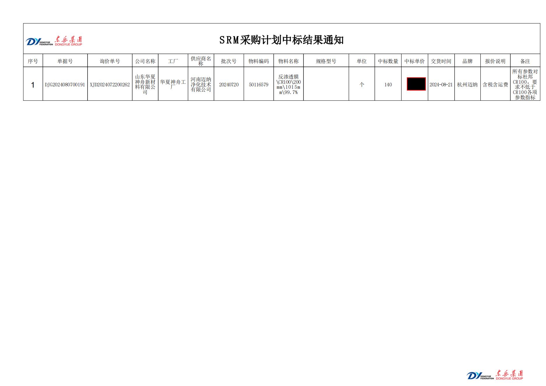2024年8月6日,东岳集团官网公布140支反渗透膜中标公告,河南迈纳净化技术有限公司再次中标!