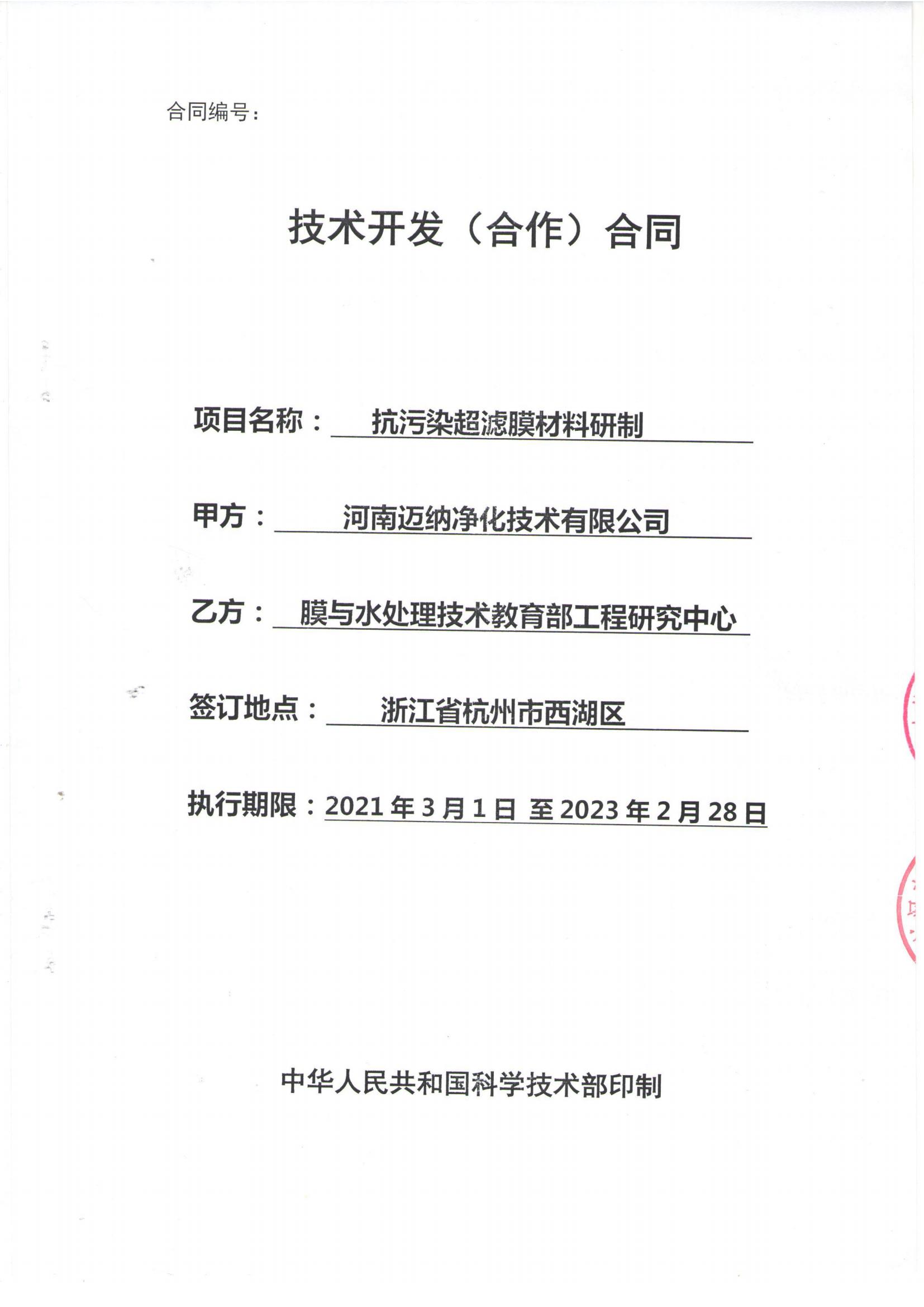 2021年迈纳与膜与水处理技术教育部工程研究中心签订技术开发合作合同